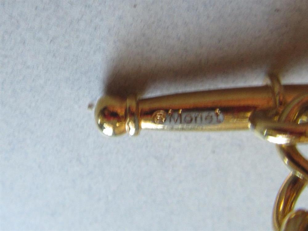 Vintage Monet HEAVY ball link chain necklace with large toggle clasp. Signed un the underside of the toggle bar. It measures 33" long. There is a rub? over the Monet mark is.