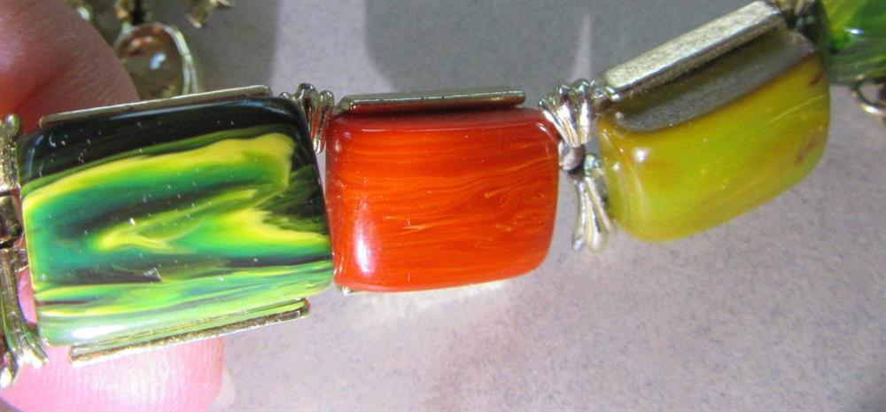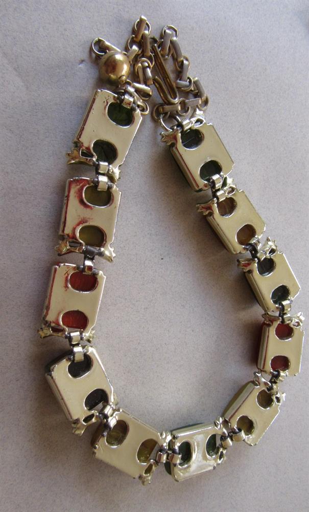 Vintage genuine bakelite multi color choker necklace. The colors on this necklace are translucent green, olive green, paprika and two sections of GORGEOUS blue moon. It measures 16" long from tip to tip, not including the hook.