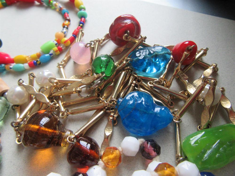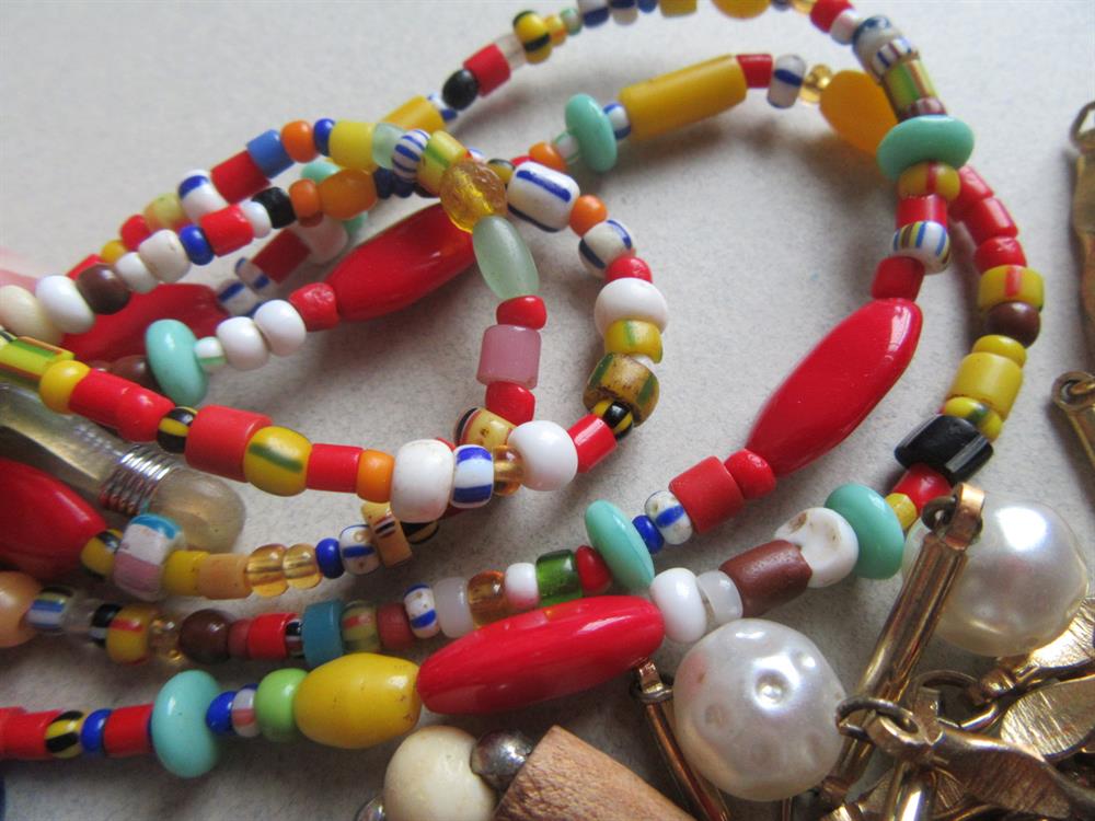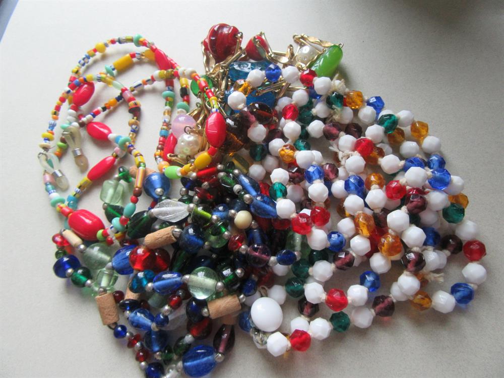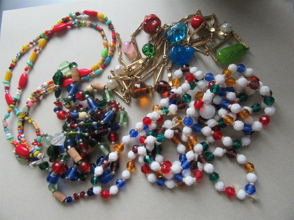 Vintage all glass beads lot. Three necklaces and one eye glass holder. Strictly being sold as a craft lot, although the necklace with the large glass beads and gold tone spacers is totally wearable, but the gold links have a tendency to kink up. All beads in good shape, but needs restringing and strictly sold as a crafting lot.