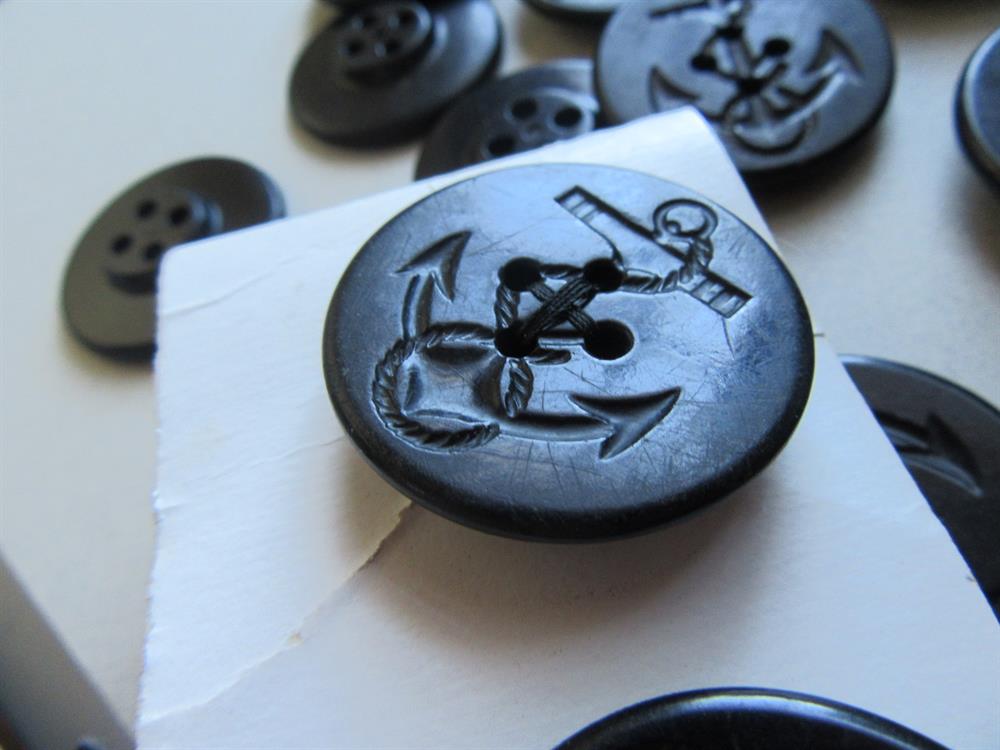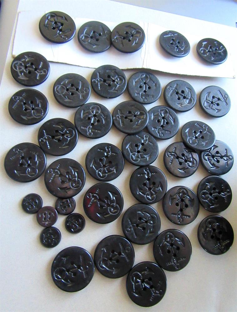 Vintage four hole pea coat buttons lot. The large buttons measures 1 1/4" across. There are 33 large buttons and 5 small buttons in various states of wear. No chips or cracks. Some are older than others.
