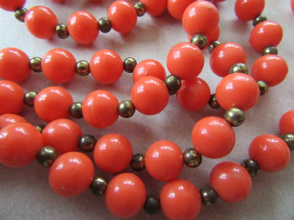 Vintage orange and red necklace lot. The necklace in the center has matching earrings and it is signed Japan. Has some were on a few beads. The necklace on the right has metal bead spacers that have darkened. The necklace at the top is missing the proper bead extender. Lot sold as is for crafts.