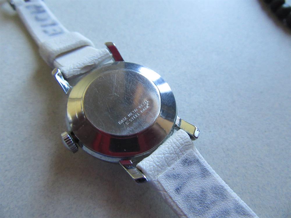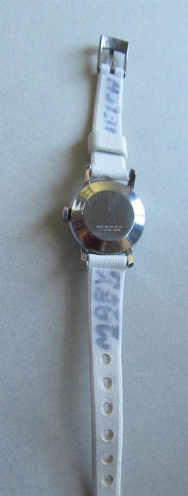 Back reads Stainless Steel. The vinyl watch band has writing on the interior. Obviously Mary Welch was the owner. I am sure she loved her watch.