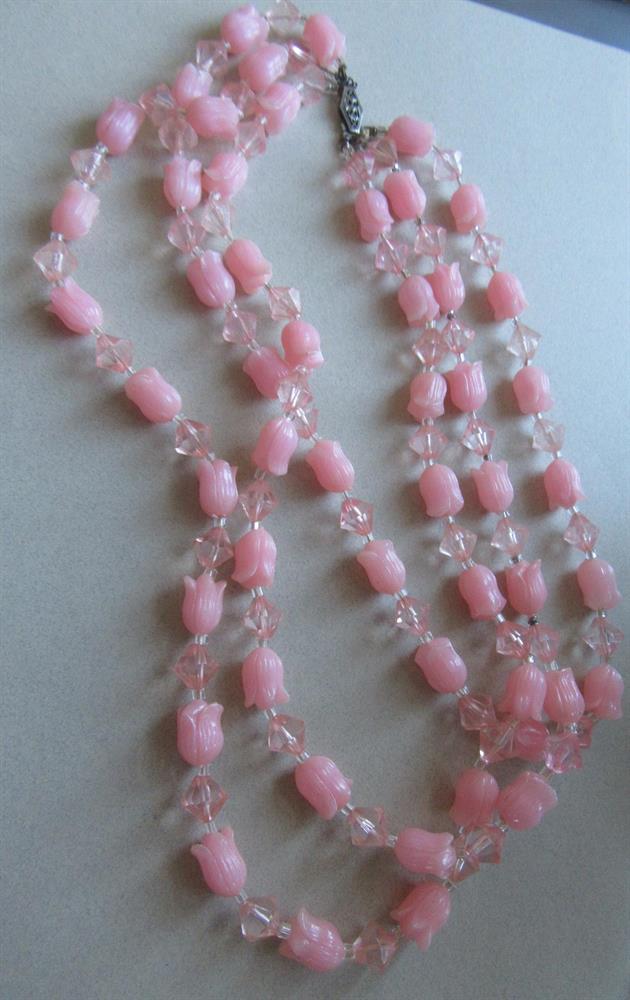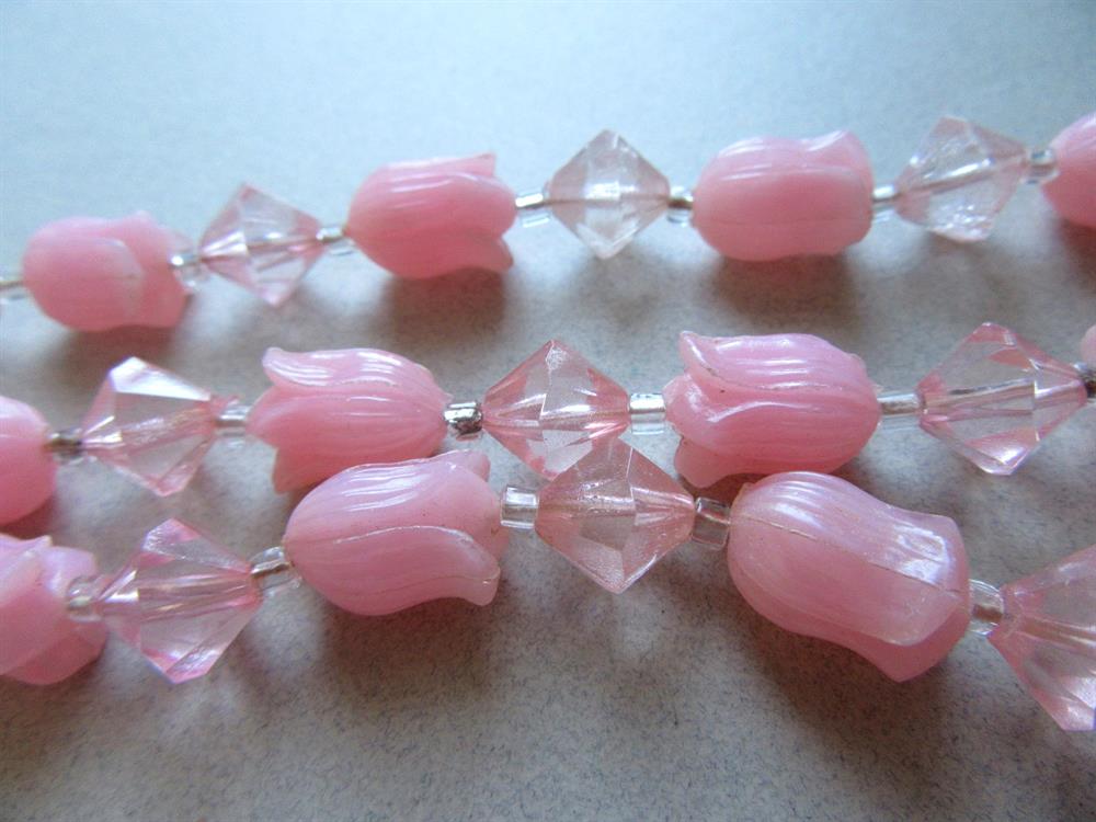 Vintage 1950's pink lucite tulips multi strand necklace. The SHORTEST strand measures "18 long. This necklace looks like it was restrung. It has a "granny" style interlocking clasp. Wear or take apart and make your own creation. Beads are in wonderful shape. Three of the glass seed beads are darker than the others. The clasp looks like sterling.
