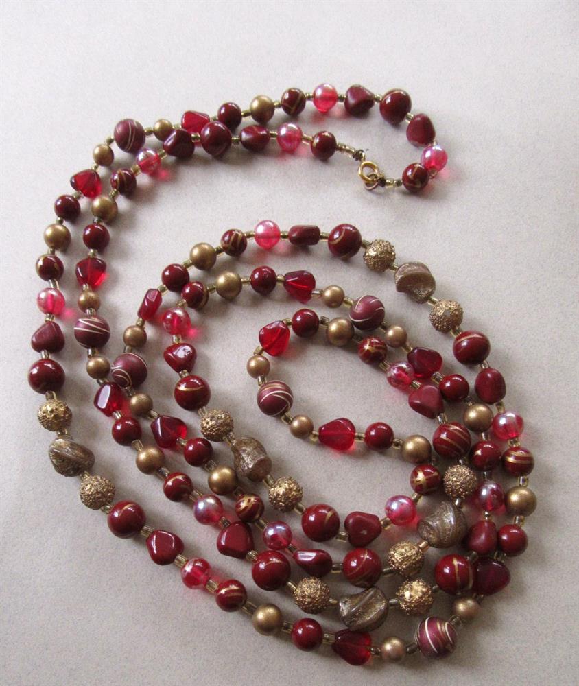 Vintage long red and gold lucite and glass necklace. It measures 54" long. A few beads have some minor wear. Hard to notice when worn. Sold as found.