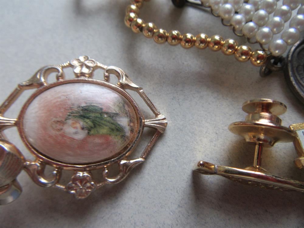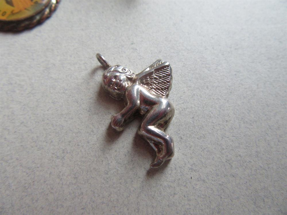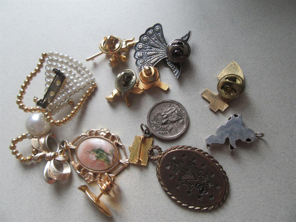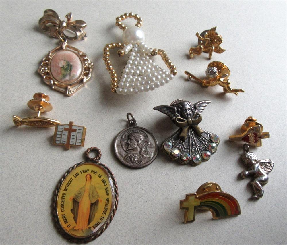 Vintage religious jewelry lot. The hollow silver angel charm may be sterling, although it is unmarked. Some wear to the Jesus bow pin. the rest are ol! All lots sold all sales final.