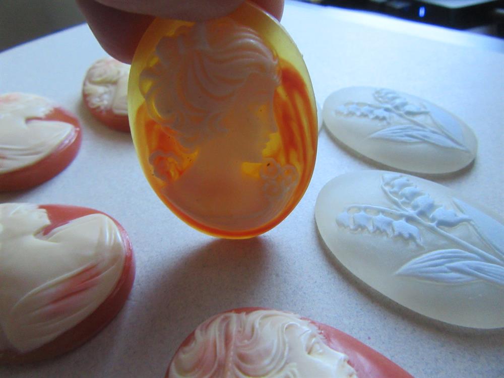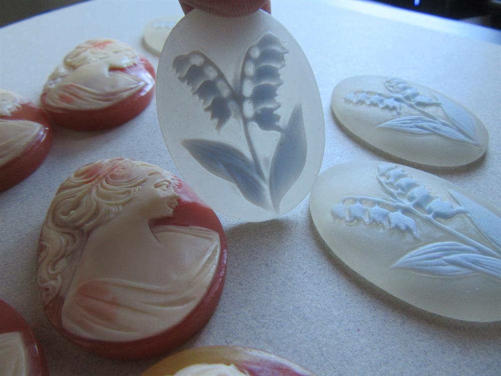Vintage resin cameos and frosted Lilly of the Valley cabochons.