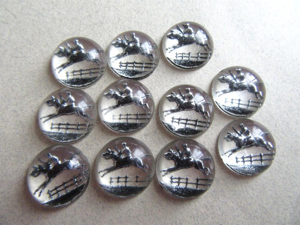 Eleven horse riding reverse painted glass cabochons. Most likely to make tie clips. They measure approximately 1/2" across. Never used.