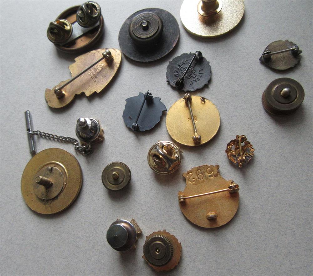 Some are lapel pins, some have threaded screw backs, some clutch backs. Please see las two photos to see the backs. All in decent shape!