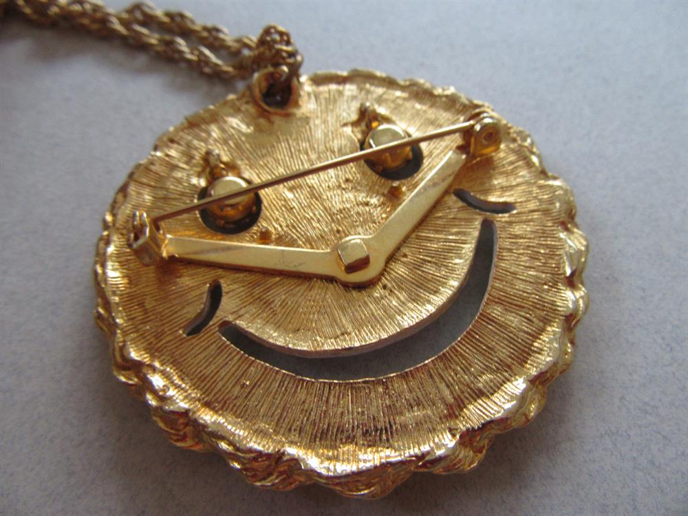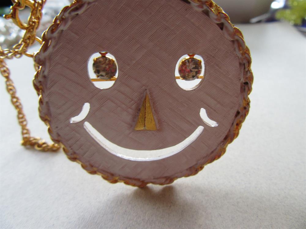 Vintage smiley face pin/pendant with jiggly rhinestone eyes. The face is white with a gold rope edging. The pendant measures 2" across. The rope chain measures 24" long. Excellent shape.