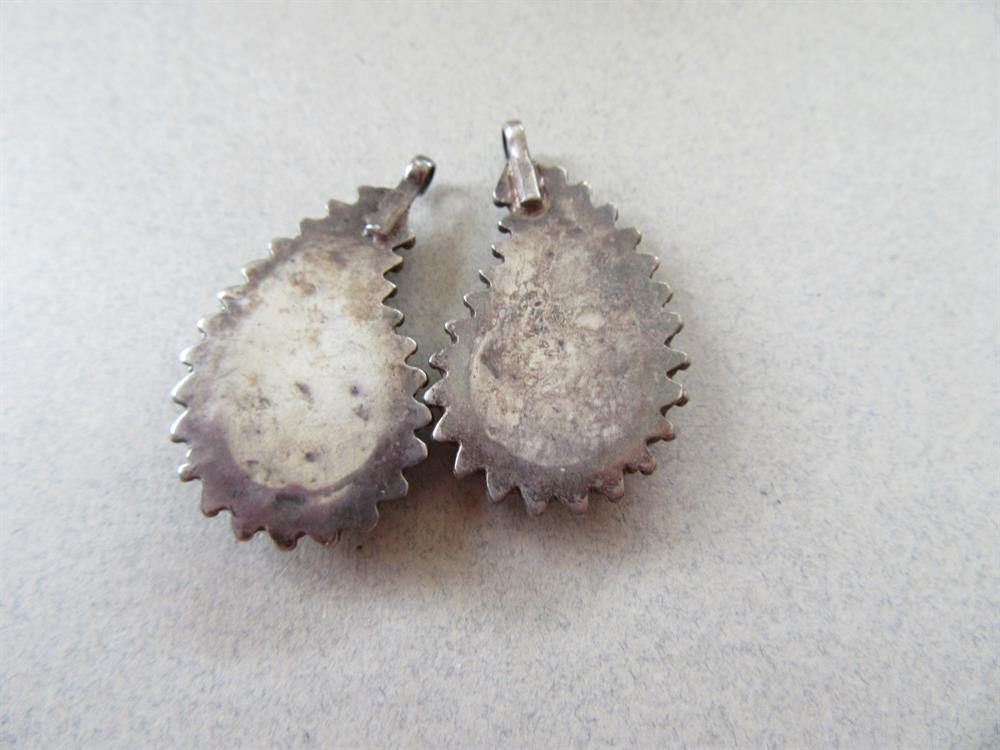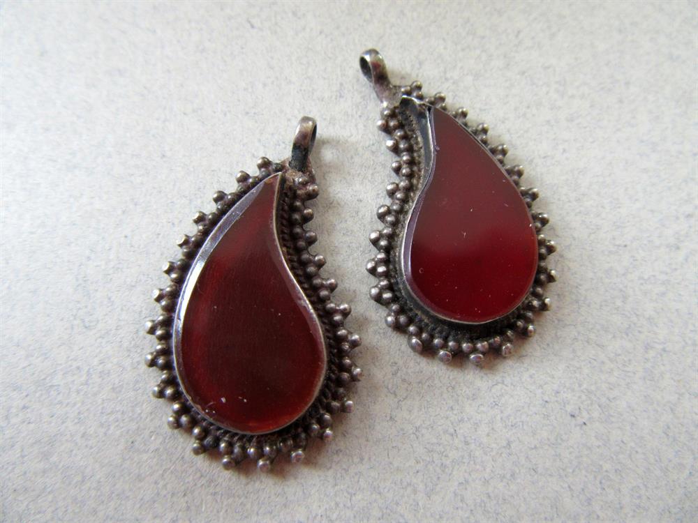 Vintage sterling silver and carnelian? stone charms. Perfect to make earrings! The backs are unmarked because it was the ear wires that are long gone that were marked. Each measures 1 1/8" long. Excellent shape.