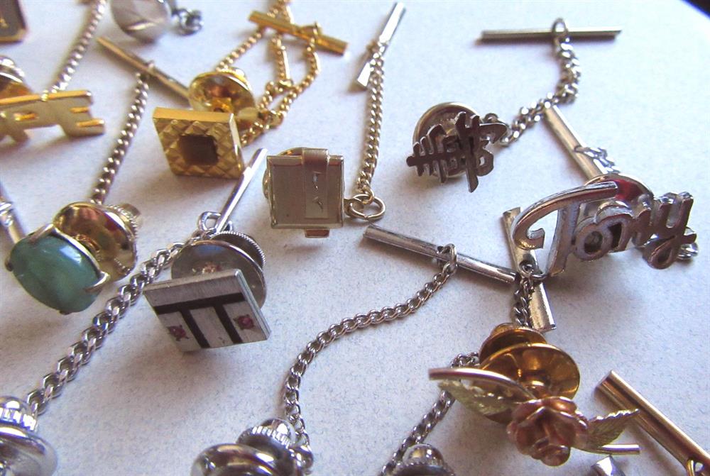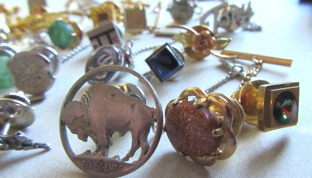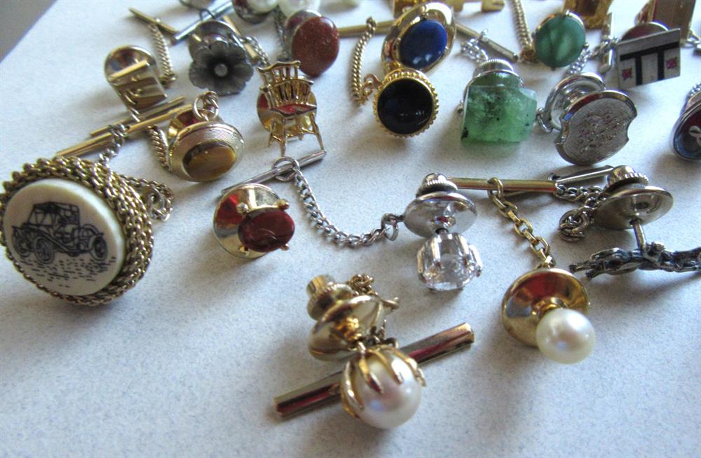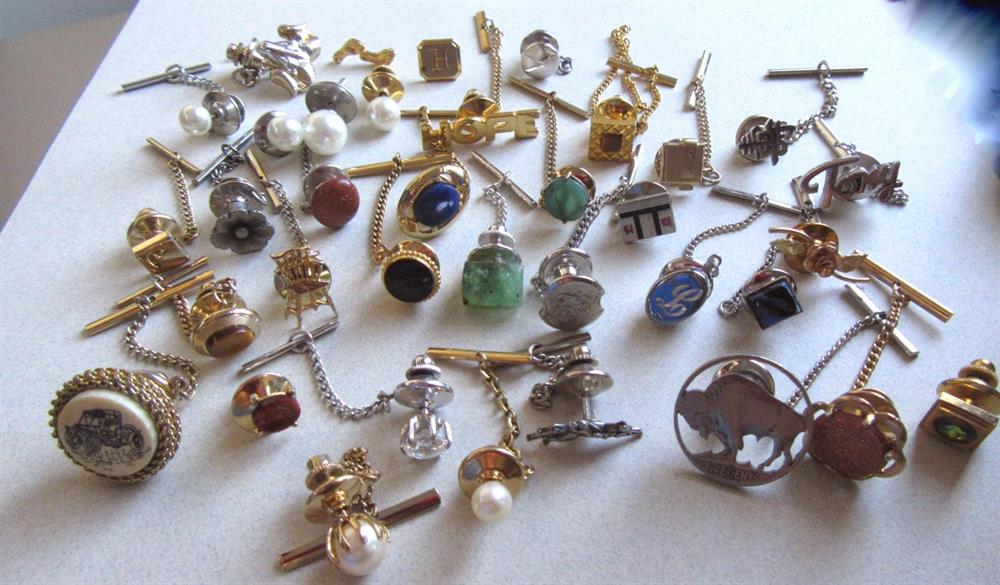 Fantastic lot of tie tacs. Assorted genuine stones including jade, goldstone, tiger eye and more. The pearl tags in the foreground are genuine pearls. The tacs in the back of the photo are faux pearls.