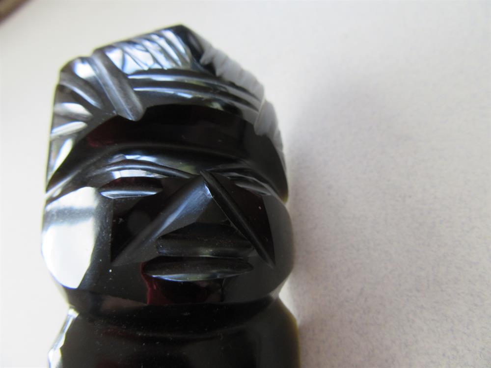 Vintage tiki letter opener that feels like cold stone and it has a slight translucency to it on the edge of the blade if help up to sunlight. It measures 5 1/2 " long and has a nip at the very end. Which I have shown front and back photos of the tip.Perhaps it can be filed. Sold as is.