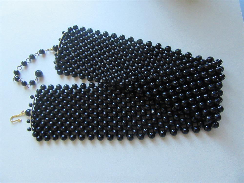 Vintage wide black lucite cbeaded choker necklace. It measures 15" long , not including the hook the 4 1/2" long bead extender or hook. It is 2" wide. Excellent shape.