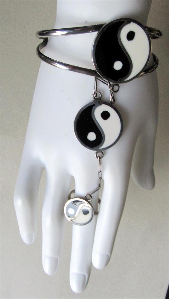 Vintage ying yang enameled cuff slave bracelet with attached adjustable ring.  This was from my vintage shop that closed in the early 1990's.