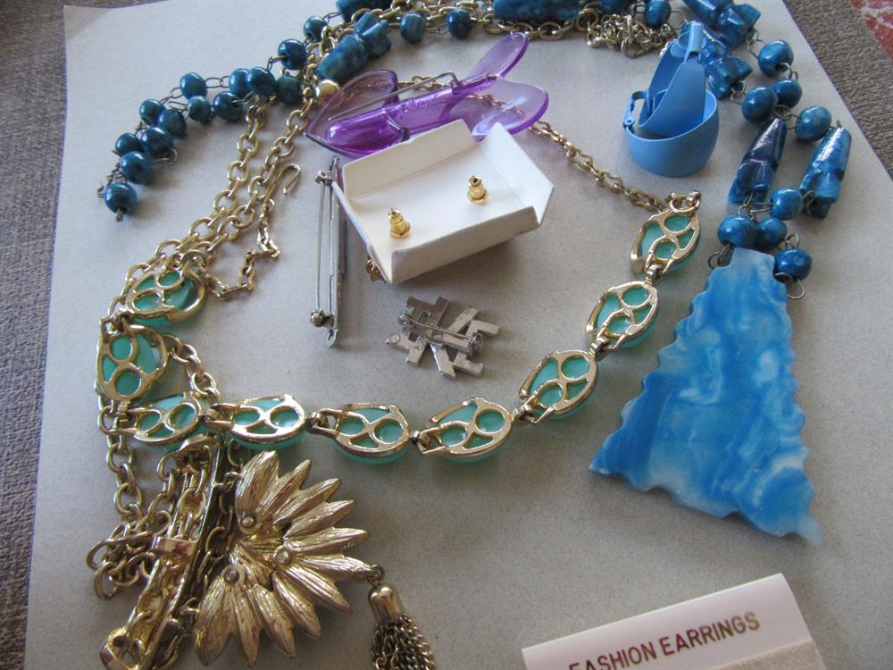 Vintage and up jewelry lot. The newest pieces would be the rhinestone necklace on the left. It consists of the following: