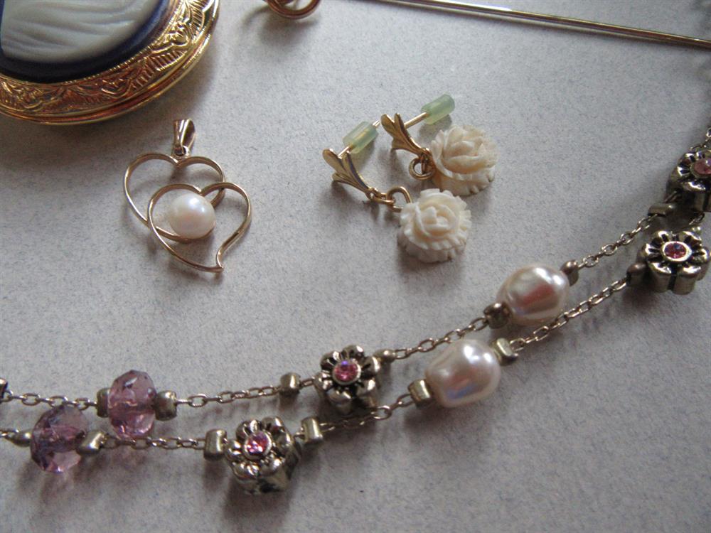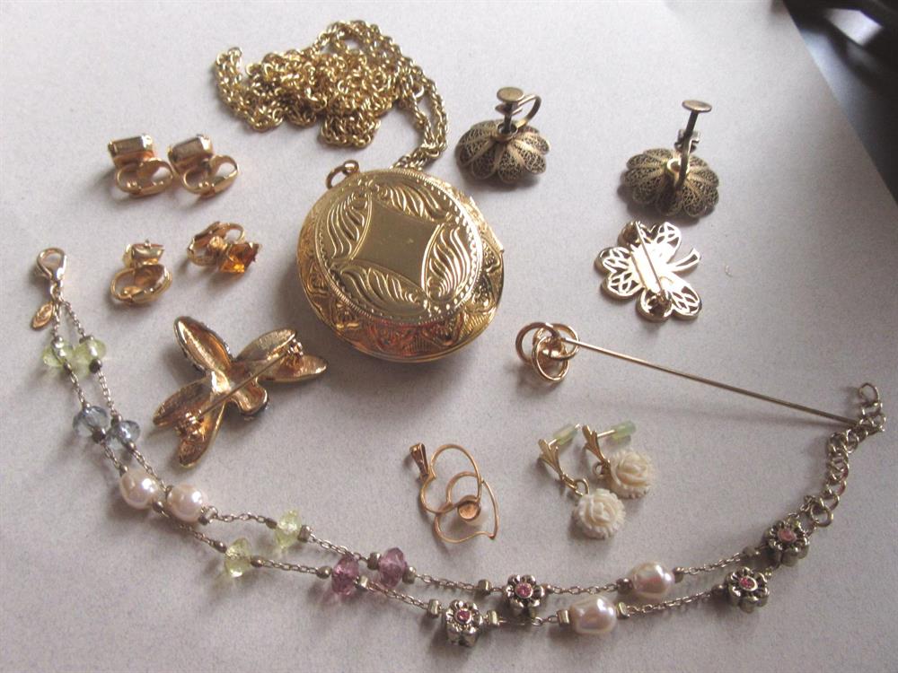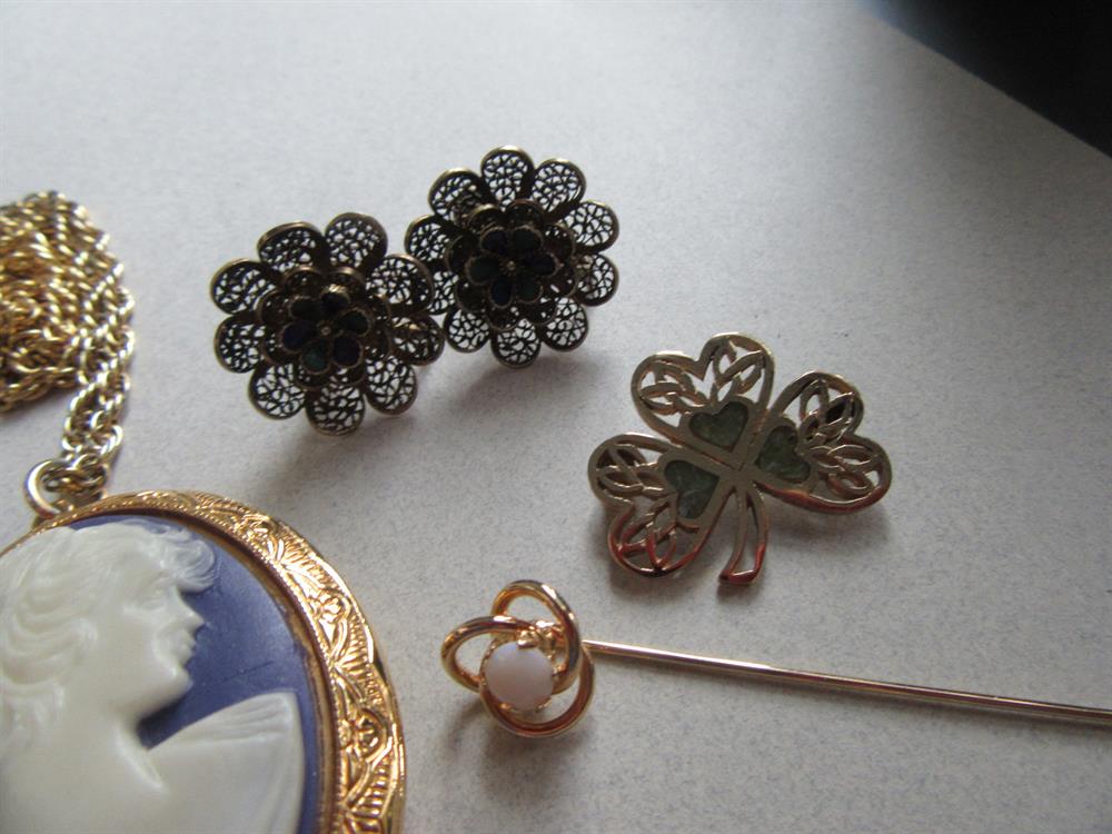 Vintage and up jewelry lot. Rhinestone clip earrings, filigree spun screw back earrings, carved bone pierced earrings, a heart pendant, a blue faux cameo photo locket with long chain, faux opal stick pin and a shamrock pin.