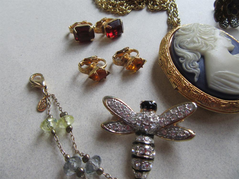 Vintage and Up Jewelry Lot Pins Earrings Cameo Pendant Bee Premier Design Bracelet