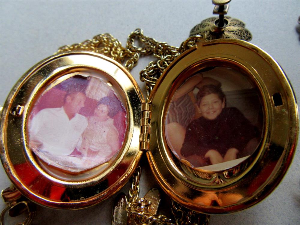 The cameo locket has photos glued into the center which can be removed. Locks fine.