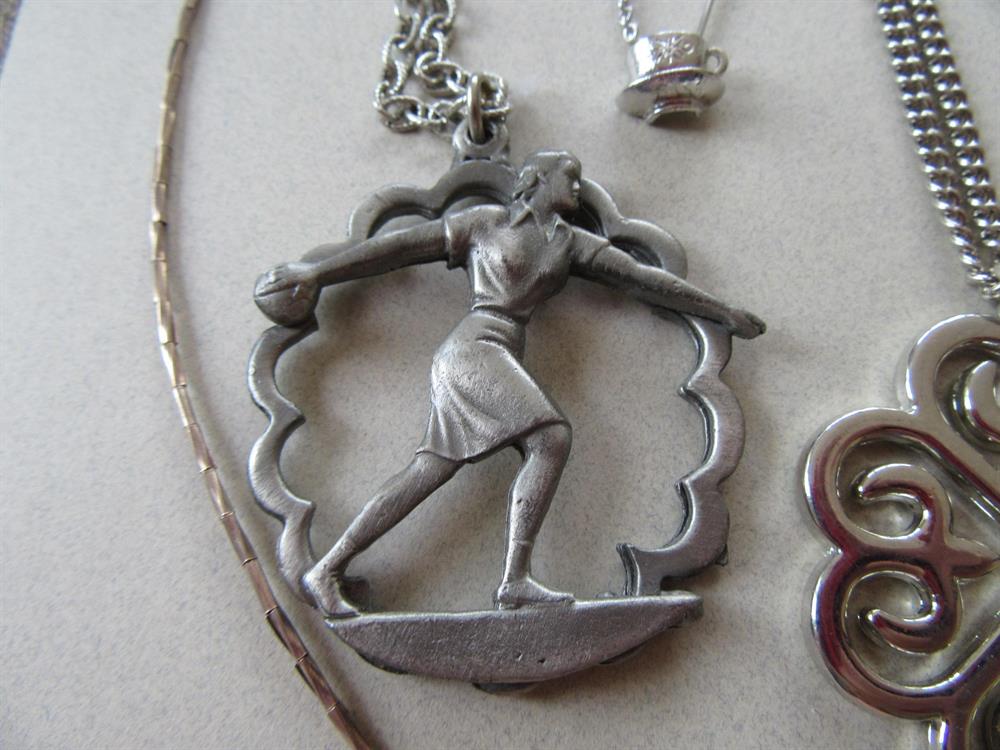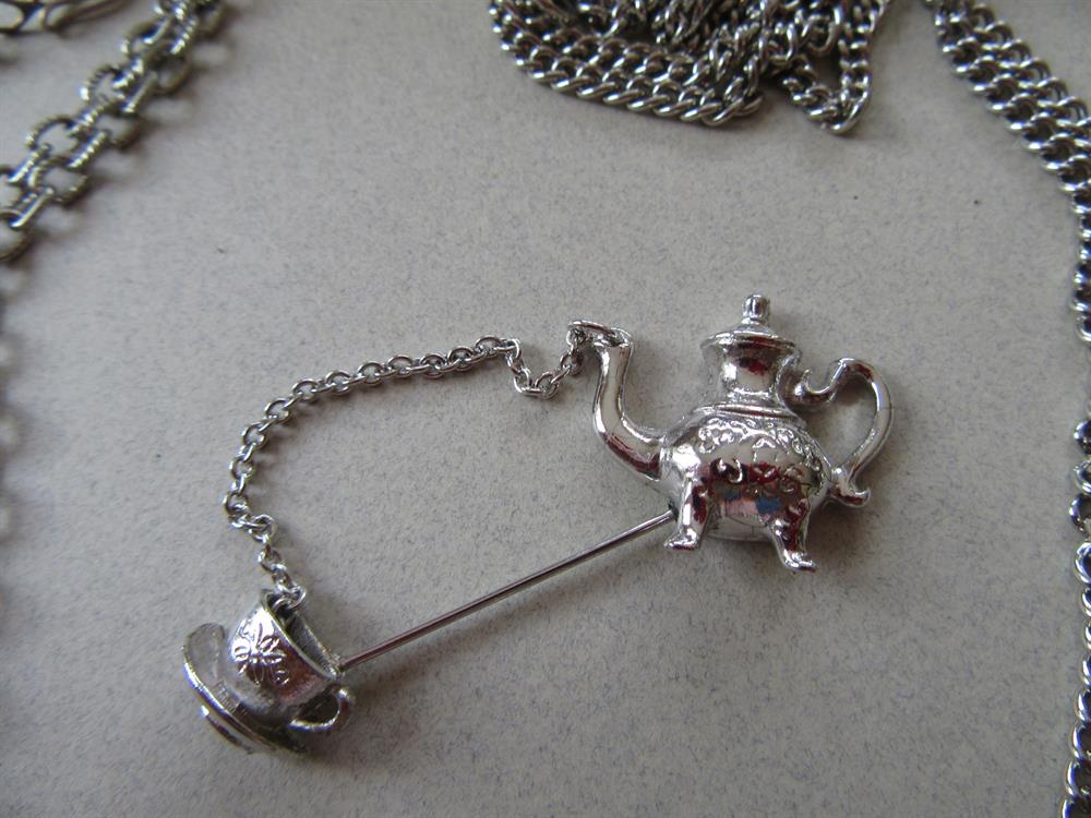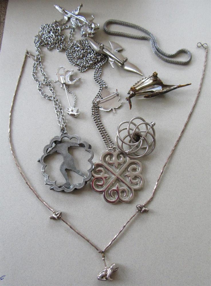 Vintage and up jewelry lot featuring a mid century ladies bowler necklace, spiral pin, seagull pin, rose pin, liquid silver frog necklace, sterling maple leaf pin, Avon tea pot pin, scroll pendant necklace and I am throwing in the lucite jelly belly sailfish pin that has a broken tale fin in and wear.