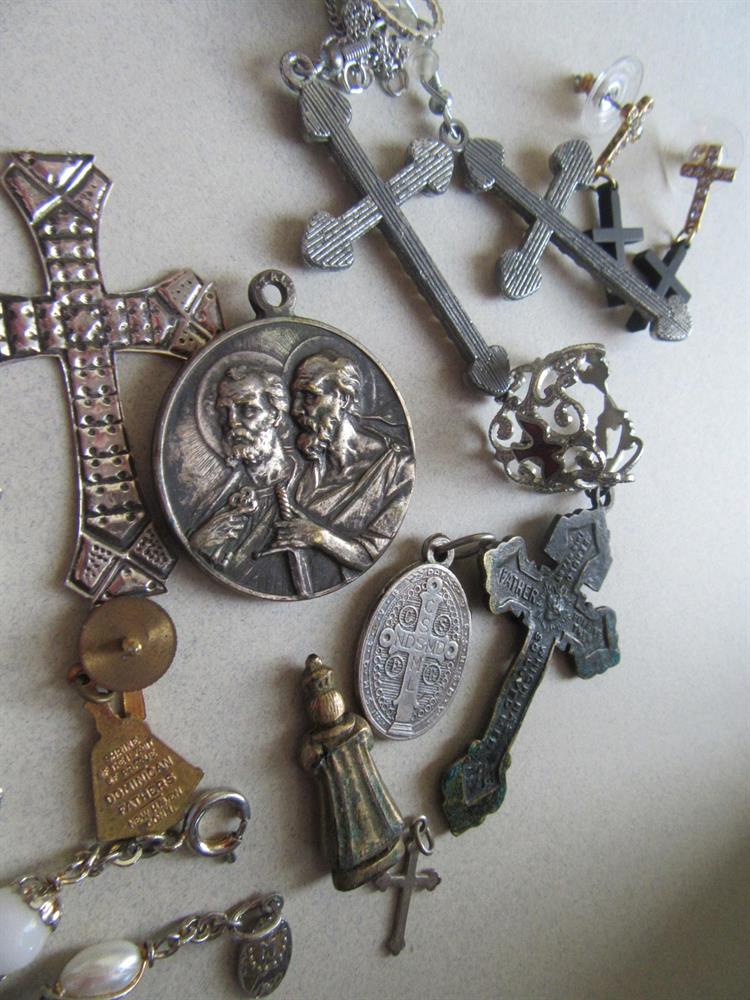 Vintage and Up religious jewelry lot. Cross earrings and ear hangers (never worn) , two Child of Prague charms that have some wear, medals, faux pearl bracelet with Mary medal that has some pearl wear on the last round bead, silver tone ring, rhinestone cross earrings and the rest!