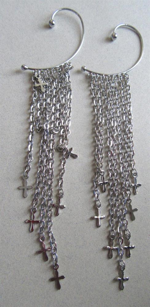 *The shiny silver cross necklace next to the large rhinestone earrings is signed Sarah Coventry and the chain is tangled and broken.