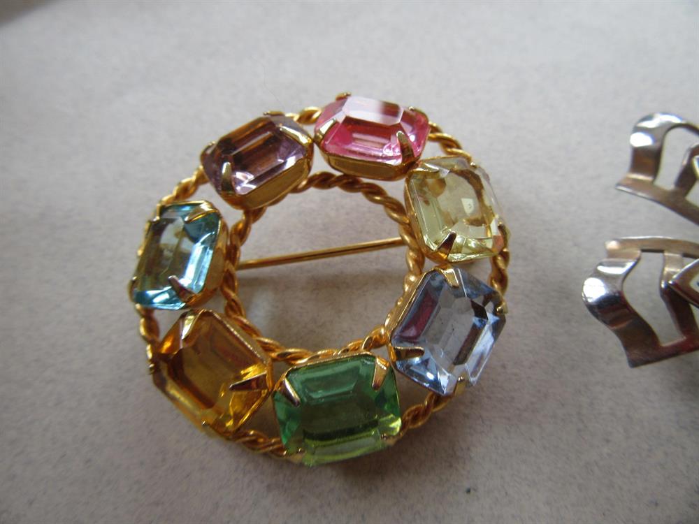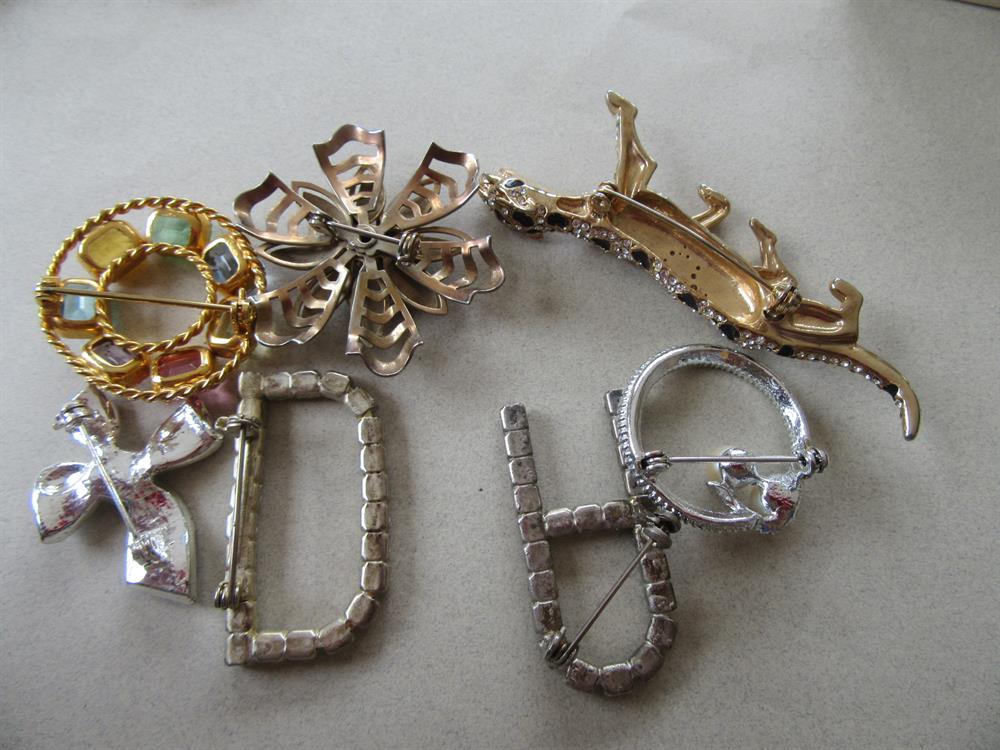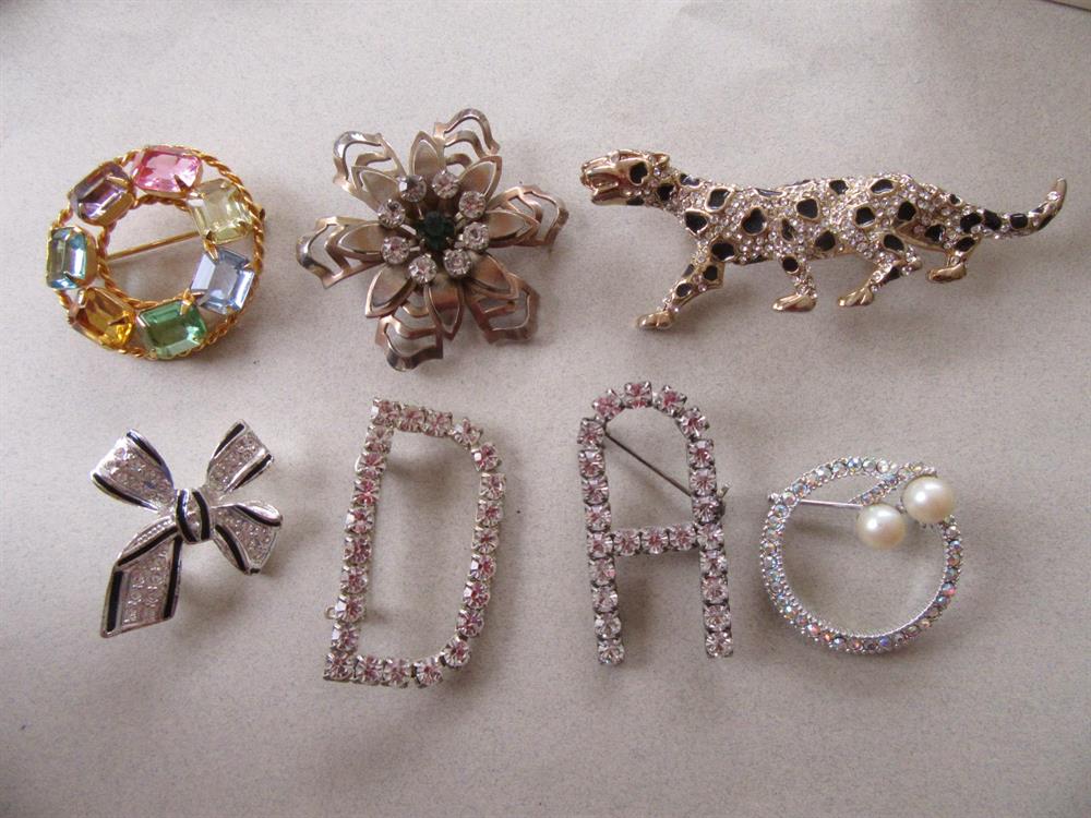 Vintage and Up Rhinestone Pin Lot with initials D and A , a pastel circual pin, bow, circular aurora pin with faux pearls a snowflake pin and newer leopard pin. All in good shape.