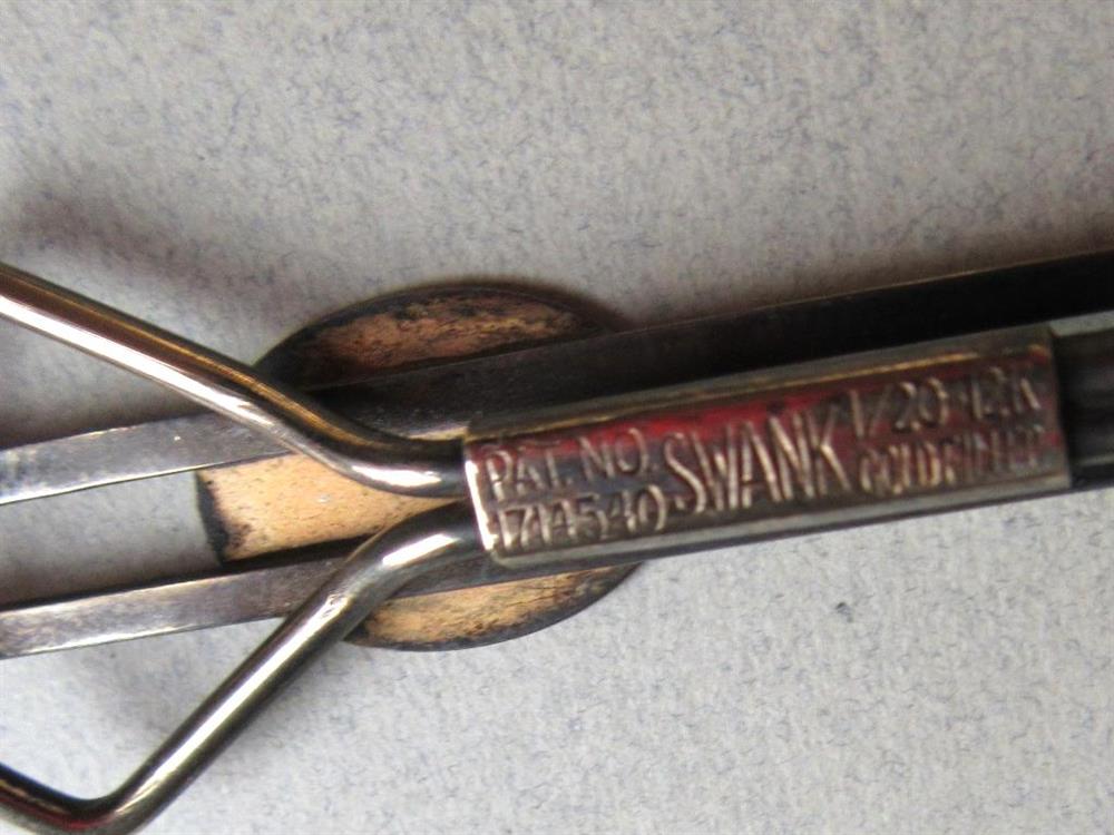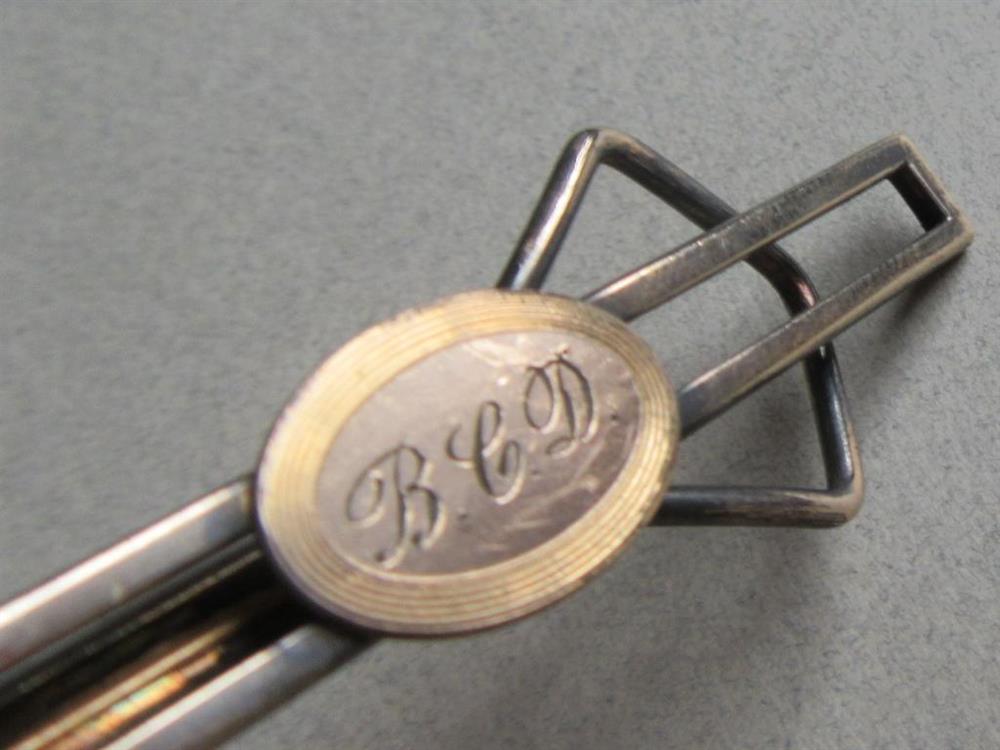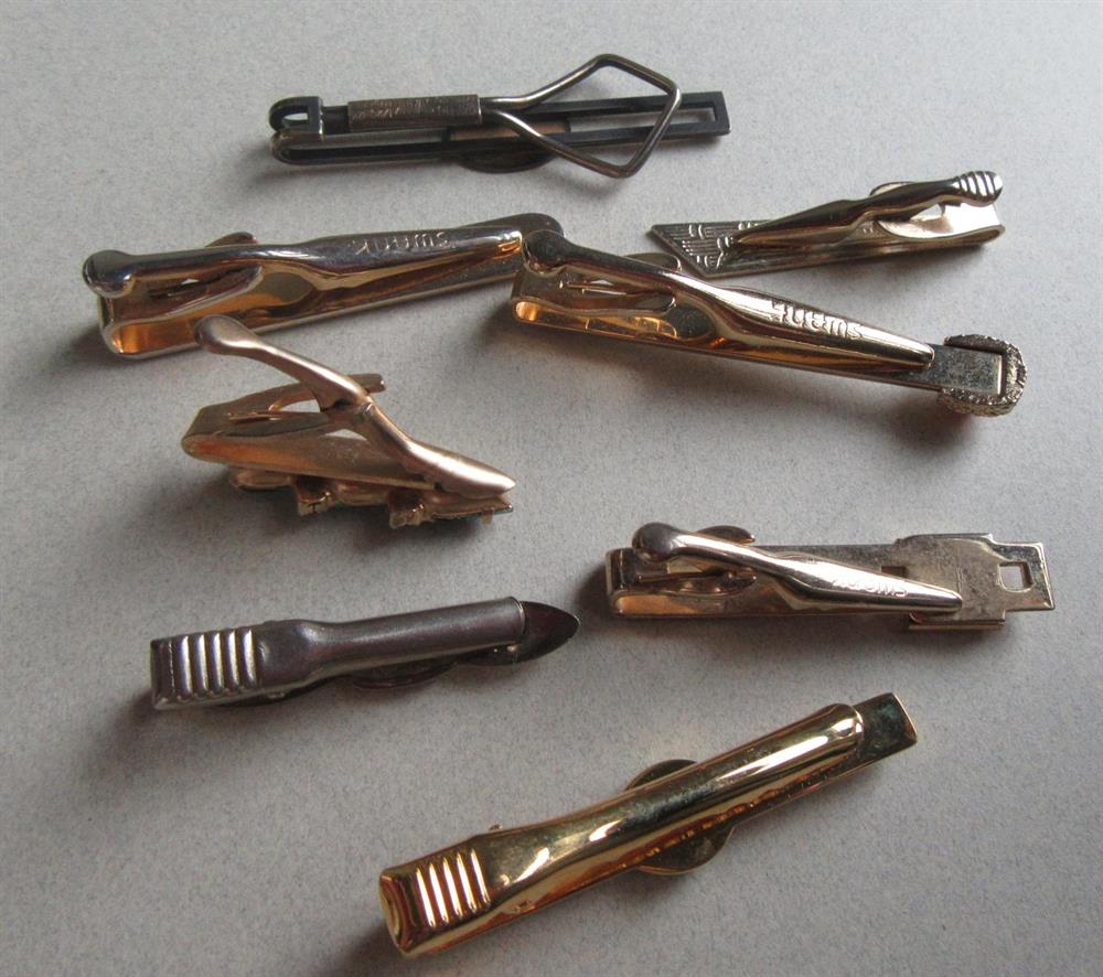Vintage Tie bar and clip lot. the one in the back left corner has initials and is gold filled. The green rhinestone tie clip is SO great. And the rest! all in decent shape, The longest ones measure 2 1/4" long.